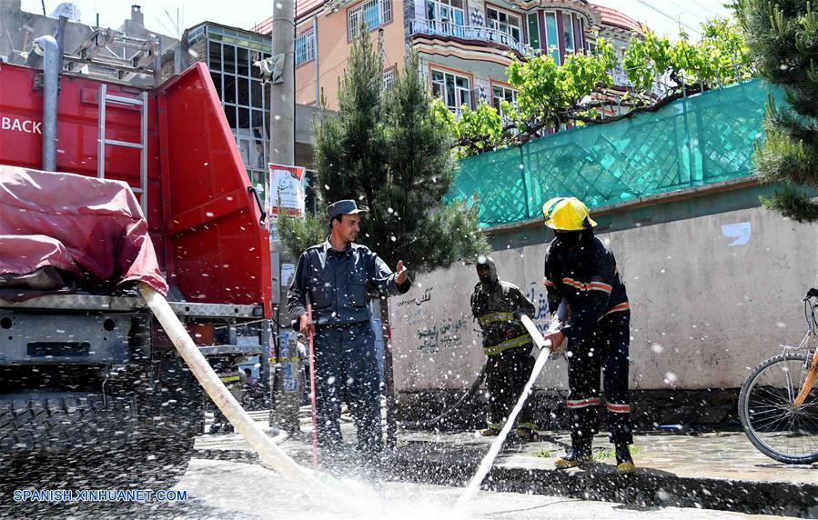 KABUL, abril 22, 2018 (Xinhua) -- Bomberos limpian el sitio donde se registró una explosión, en Kabul, Afganistán, el 22 de abril de 2018. (Xinhua/Dai He)