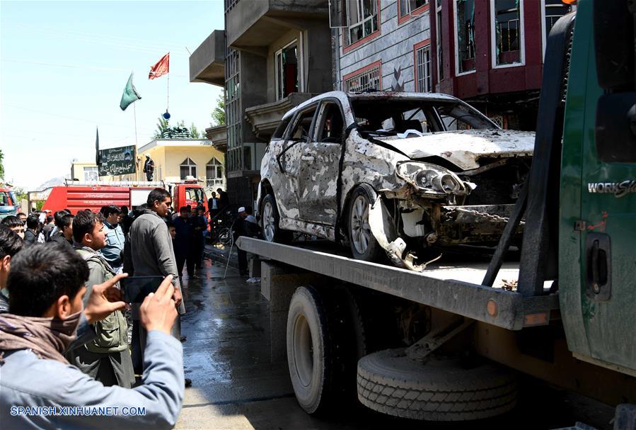 KABUL, abril 22, 2018 (Xinhua) -- Personas observan un vehículo da?ado cerca del sitio donde se registró una explosión, en Kabul, Afganistán, el 22 de abril de 2018. (Xinhua/Dai He)