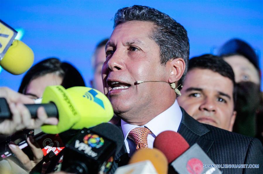 El candidato presidencial del partido Avanzada Progresista (AP), Movimiento al Socialismo (MAS) y el Comité de Organización Política Electoral Independiente (COPEI), Henri Falcón (frente), conversa con representantes de los medios de comunicación luego de la presentación de su programa de Gobierno, en Caracas, Venezuela, el 23 de abril de 2018. (Xinhua/Andrea Romero)