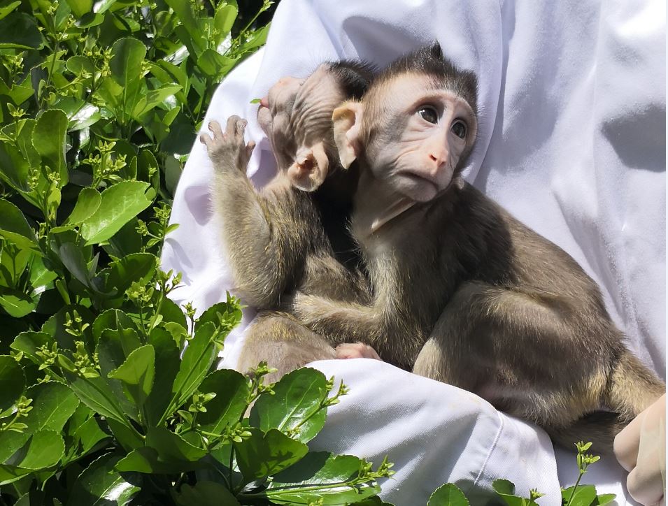 Zhongzhong y Huahua, los primeros monos clonadosa partir de células somáticas, toman el sol este lunes en Shanghai. Los primates fueron creados a finales del a?o pasado en el Instituto de Neurociencias de la Academia China de Ciencias. Aún están siendo alimentados con biberón y crecen normalmente. [Foto: proporcionada]