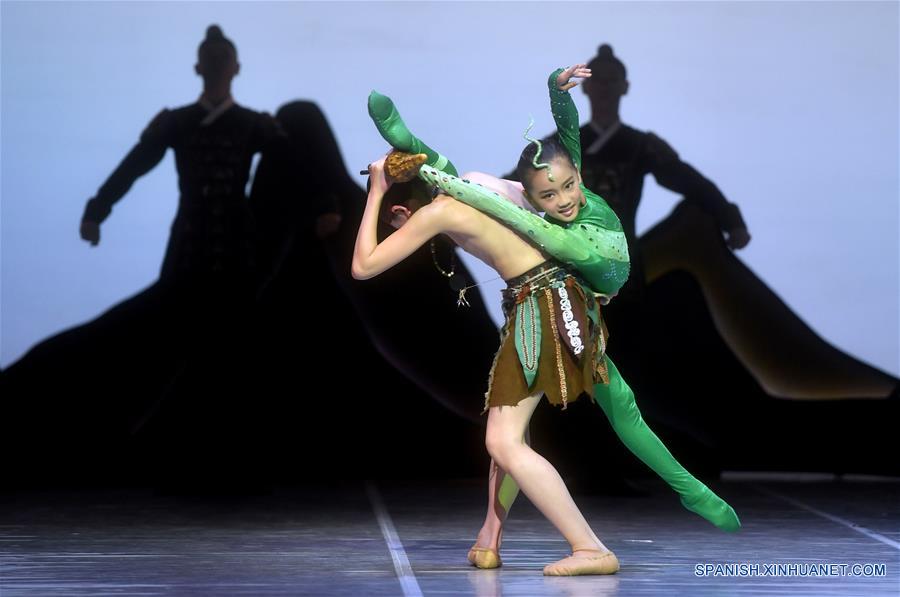 Imagen del 23 de abril de 2018 de bailarines del Ballet Nacional de China interpretando "El Ciervo de Nueve Colores" en el Centro de Artes Escénicas Tianqiao, en Beijing, capital de China. El ballet cuenta la historia de un rey ciervo pintado en las paredes de las grutas de Dunhuang Mogao en una zona de cruce cultural y religioso en la antigua Ruta de la Seda en la provincia de Gansu, noroeste de China. (Xinhua/Jin Liangkuai)