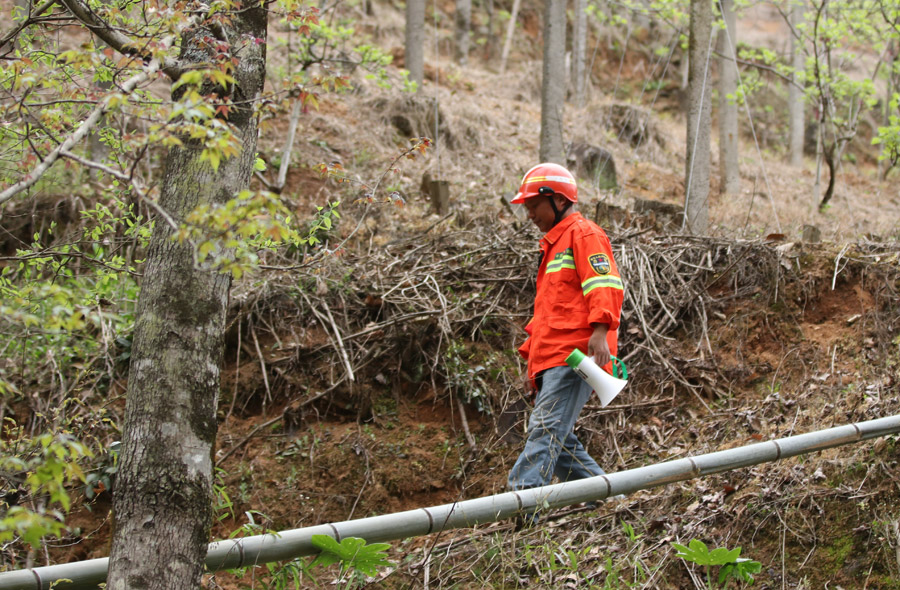 Un empleado forestal en el condado de Jingde, provincia de Anhui, patrulla una zona boscosa. [Foto de Zhu Lixin / China Daily]