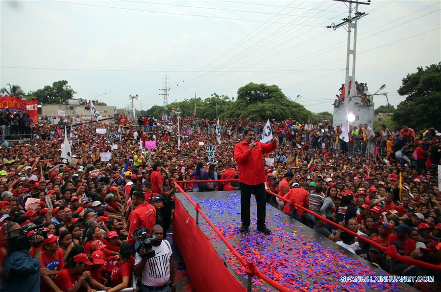 Imagen cedida por la Presidencia de Venezuela del presidente venezolano y candidato a la presidencia por el Frente Amplio de la Patria (FAP), Nicolás Maduro (arriba), saludando durante un evento de campa?a, en el sector Aragüita, en el municipio de Guacara, estado de Carabobo, Venezuela, el 24 de abril de 2018. El presidente de Venezuela, Nicolás Maduro, exhortó el martes a los venezolanos a participar en la jornada electoral del próximo 20 de mayo, donde buscará la reelección, y afirmó que "mientras más votos saquemos, habrá más paz, más independencia y más soberanía". (Xinhua/Presidencia de Venezuela)