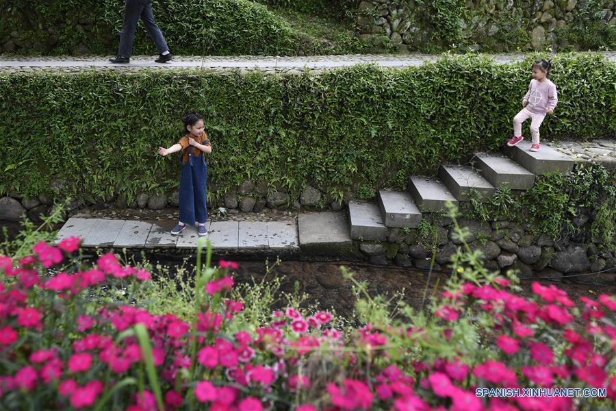Imagen del 20 de abril de 2018 de ni?os jugando en la orilla de un río, en la aldea Qingyang del pueblo de Shimen, en la ciudad de Jiangshan, en la provincia de Zhejiang, en el este de China. Desde 2003, Zhengjiang ha venido implementando un proyecto para reformar el entorno de vida de sus poblados. Hasta finales del a?o pasado, un 97 por ciento de las aldeas de la provincia habían completado la revisión. (Xinhua/Huang Zongzhi)