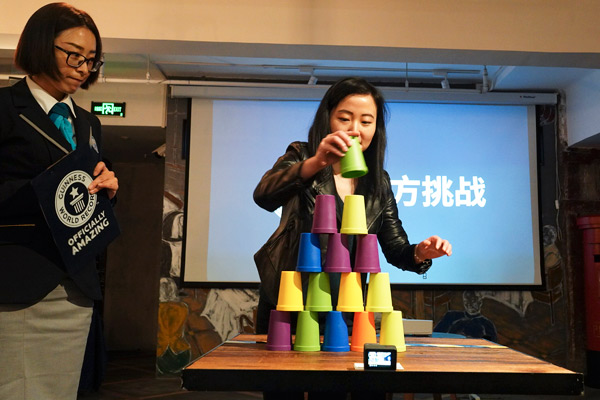 Un supervisor del Récord Guinness observa un apilamiento de vasos que busca establecer una nueva marca mundial. [Foto: Gao Erqiang/ China Daily]