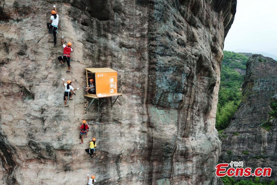 Una tienda cuelga a 100 metros de altura sobre un acantilado en el Parque Geológico Nacional Shiniuzhai en Pingjiang, provincia de Hunan. El almacén fue especialmente construido para proporcionar suministros a los escaladores. 25 de abril del 2018. (Foto: China News Service/ Yang Huafeng)