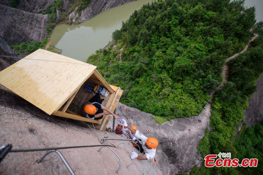 Un escalador compra una botella de agua en una tienda que cuelga a 100 metros de altura sobre un acantilado en el Parque Geológico Nacional Shiniuzhai en Pingjiang, provincia de Hunan. El almacén fue especialmente construido para proporcionar suministros a los escaladores. 25 de abril del 2018. (Foto: China News Service/ Yang Huafeng)