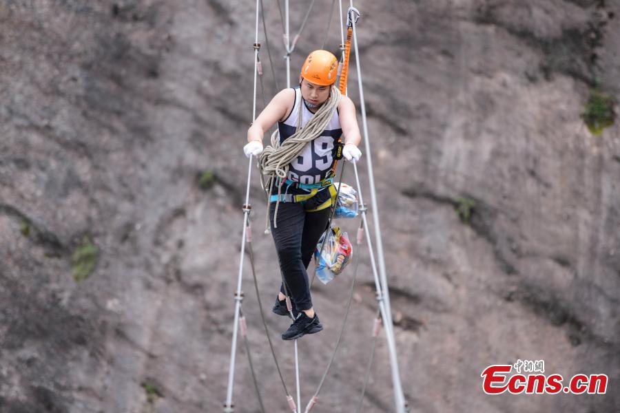 Un empleado transporta mercancías hacia una tienda que cuelga a 100 metros de altura sobre un acantilado en el Parque Geológico Nacional Shiniuzhai en Pingjiang, provincia de Hunan. El almacén fue especialmente construido para proporcionar suministros a los escaladores. 25 de abril del 2018. (Foto: China News Service/ Yang Huafeng)