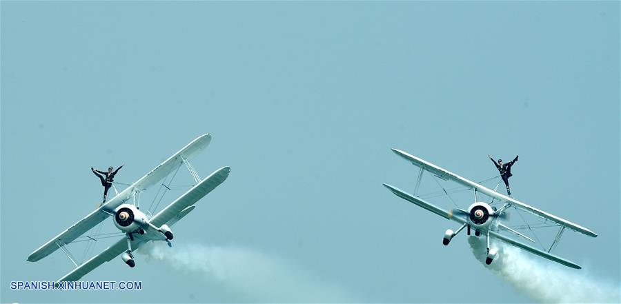 HENAN, abril 27, 2018 (Xinhua) -- Aeronaves acrobáticas vuelan durante una exhibición llevada a cabo en el Espectáculo Aéreo de Zhengzhou 2018, en Zhengzhou, capital de la provincia de Henan, en el centro de China, el 27 de abril de 2018. El Espectáculo Aéreo de Zhengzhou 2018 comenzó el viernes. (Xinhua/Feng Dapeng)