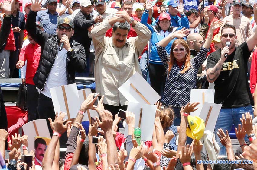 Imagen cedida por la Presidencia de Venezuela, del presidente venezolano y candidato a la reelección, Nicolás Maduro (2-i), participando en un evento en el marco de su campa?a presidencial rumbo a las elecciones del 20 de mayo, en estado Lara, Venezuela, el 28 de abril de 2018. De acuerdo con información de la prensa local, Nicolás Maduro asistió el sábado a la Feria Agropecuaria del estado Lara, donde anunció la aprobación de más de 300 créditos agroproductivos para residentes de ese estado. (Xinhua/Presidencia de Venezuela)