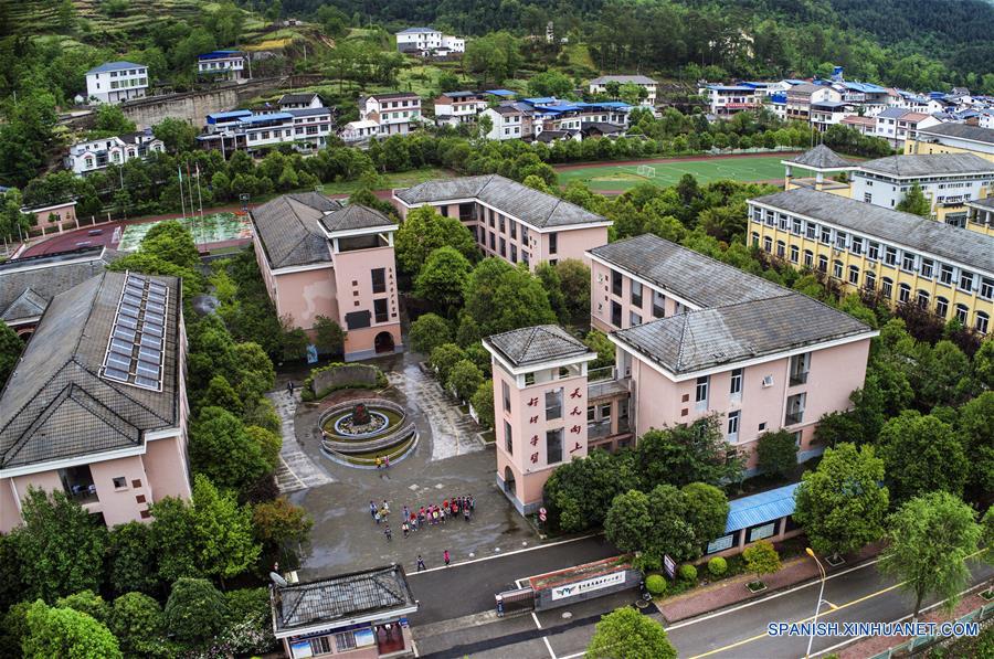 Imagen del 25 de abril de 2018 de una vista aérea del reconstruido campus de la Escuela Primaria Malu, en el condado de Qingchuan, provincia de Sichuan, en el suroeste de China. Este a?o marca el 10 aniversario del terremoto de 8.0 grados de magnitud que sacudió la provincia de Sichuan, en el suroeste de China, el 12 de mayo de 2008. Solo cuatro días después del terremoto, Xu Guang y sus 100 compa?eros de clase de la Escuela Primaria Malu sostuvieron parcartas voluntariamente para mostrar gratitud a quienes daban la mano en la reconstrucción de su escuela, que quedó en ruinas durante el terremoto. El movimiento de los ni?os causó sensación en aquel a?o. En el transcurso de 10 a?os, la ayuda a la escuela nunca se detuvo. Los apoyos a nivel nacional han permitido la construcción de un campus moderno totalmente equipado con 536 estudiantes. (Xinhua/Tao Ming)