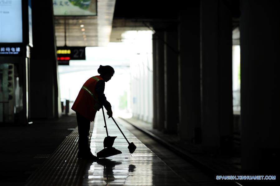 GUIZHOU, mayo 1, 2018 (Xinhua) -- Un trabajador limpia una plataforma en la Estación del Ferrocarril de Guiyang Norte, en Guiyang, provincia de Guizhou, en el suroeste de China, el 1 de mayo de 2018. Muchos trabajadores permanecieron en sus puestos en el Día Internacional del Trabajo 2018 mientras el país goza de tres días de vacaciones. (Xinhua/Yang Wenbin)