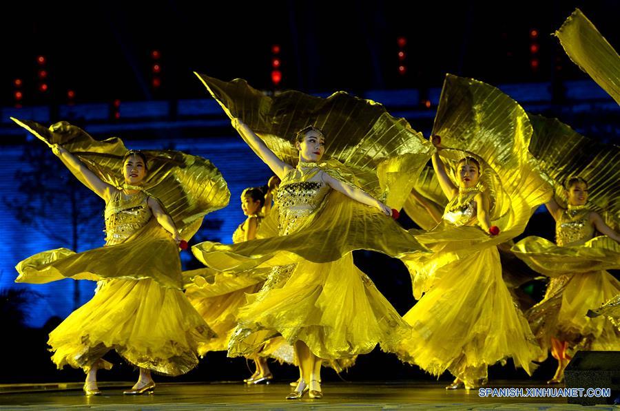 Imagen del 1 de mayo de 2018 de artistas realizando una presentación durante en un espectáculo de luz llevado a cabo en Xi'an, capital de la provincia de Shaanxi, en el noroeste de China. Tecnología de iluminación, arte moderno y cultura tradicional fueron idealmente mezclados en el espectáculo de luz. (Xinhua/Liu Xiao)
