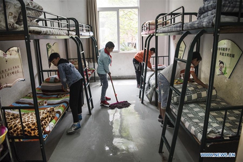 Estudiantes de quinto a?o de la escuela primaria Malu limpian su dormitorio en el distrito Qingchuan, provincia de Sichuan, 25 de abril de 2018. Este a?o se conmemora el décimo aniversario del terremoto de 8,0 grados de magnitud que sacudió la provincia suroccidental china de Sichuan el 12 de mayo de 2008. Sólo cuatro días después del terremoto, Xu Guang y sus 100 compa?eros de clase de la Escuela Primaria Malu exhibieron pancartas voluntariamente para mostrar su gratitud a aquellos que colaboraron en la reconstrucción de su escuela, que se derrumbó durante el terremoto. Ese acto de los ni?os causó sensación ese a?o. Después de 10 a?os, la ayuda a la escuela nunca se ha detenido. Los apoyos nacionales han servido para convertir la escuela en un campus moderno totalmente equipado con 536 estudiantes. (Xinhua / Tao Ming)