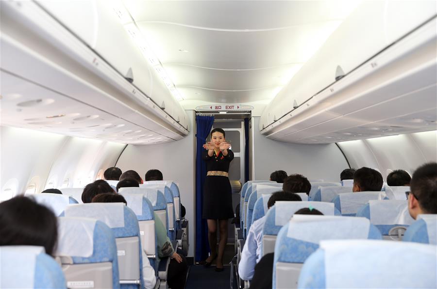 Una azafata da instrucciones de seguridad a los pasajeros en el vuelo EU2796, el 2 de mayo de 2018. El avión de pasajeros regional ARJ21, desarrollado por China, empezó el miércoles a volar en una serie de nuevas rutas en la provincia de Heilongjiang, anunció la Corporación de Aviones Comerciales de China (COMAC, por sus siglas en inglés). La inauguración de las nuevas rutas aéreas en las que opera el ARJ21 representa las operaciones de vuelo comercial del modelo en el extremo septentrional y la región extremadamente fría del país, según las fuentes de la COMAC, con sede en Shanghai. (Xinhua/Ding Ting)