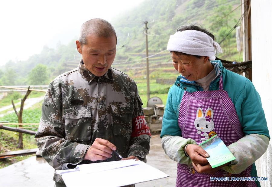 CHONGQING, mayo 5, 2018 (Xinhua) -- Imagen del 4 de mayo de 2018 de Bin Yuanpeng (i) promoviendo el conocimiento acerca de la protección del bosque a una residente en una villa cerca de la Reserva Natural Nacional Yintiaoling, en el condado de Wuxi de la municipalidad de Chongqing, en el suroeste de China. Bin Yuanpeng, un guardabosques de 59 a?os de edad, ha trabajado en la granja forestal Baiguo de la Reserva Natural Nacional Yintiaoling durante 26 a?os. El trabajo principal de Bin es patrullar y promover el conocimiento de la protección del bosque para evitar algunas actividades ilegales y prevenir desastres naturales. Junto con sus compa?eros de trabajo, Bin siempre patrulla el bosque desde temprano en la ma?ana hasta el anochecer. Debido a sus enfuerzos constantes, el sistema de ecología del bosque ha sido en cierta medida obviamente importado. (Xinhua/Wang Quanchao)