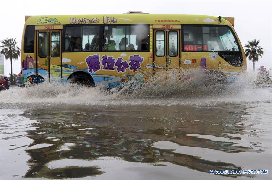 Un autobús transita por una calle inundada en Xiamen, en la provincia de Fujian, en el sureste de China, el 7 de mayo de 2018. La zona registró inundaciones repentinas debido a las fuertes lluvias. (Xinhua/Zeng Demeng)