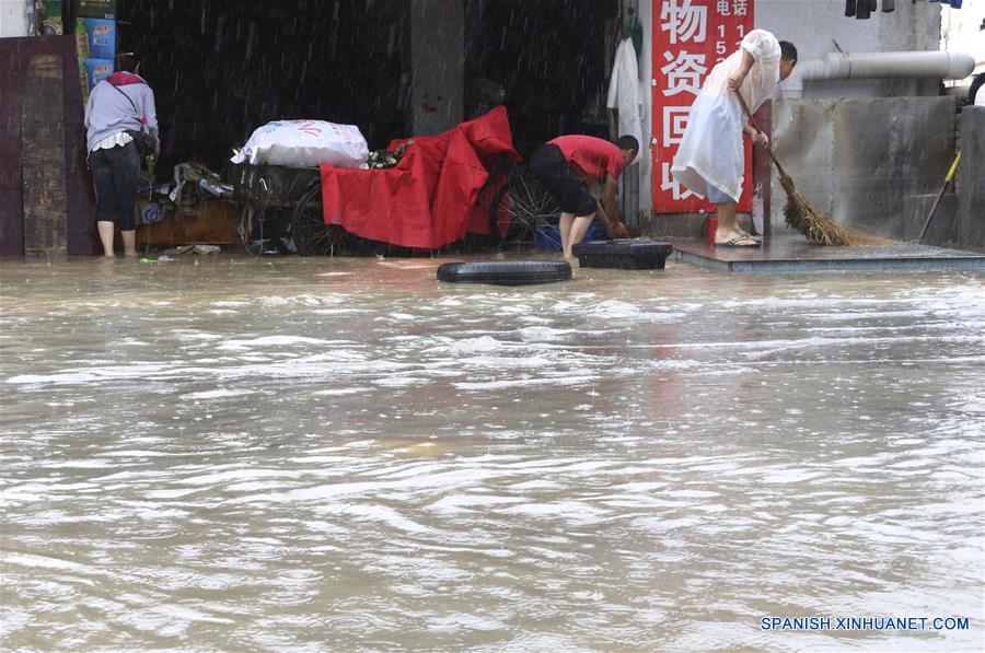 Personas drenan agua de la inundación en Xiamen, en la provincia de Fujian, en el sureste de China, el 7 de mayo de 2018. La zona registró inundaciones repentinas debido a las fuertes lluvias. (Xinhua/Zeng Demeng)