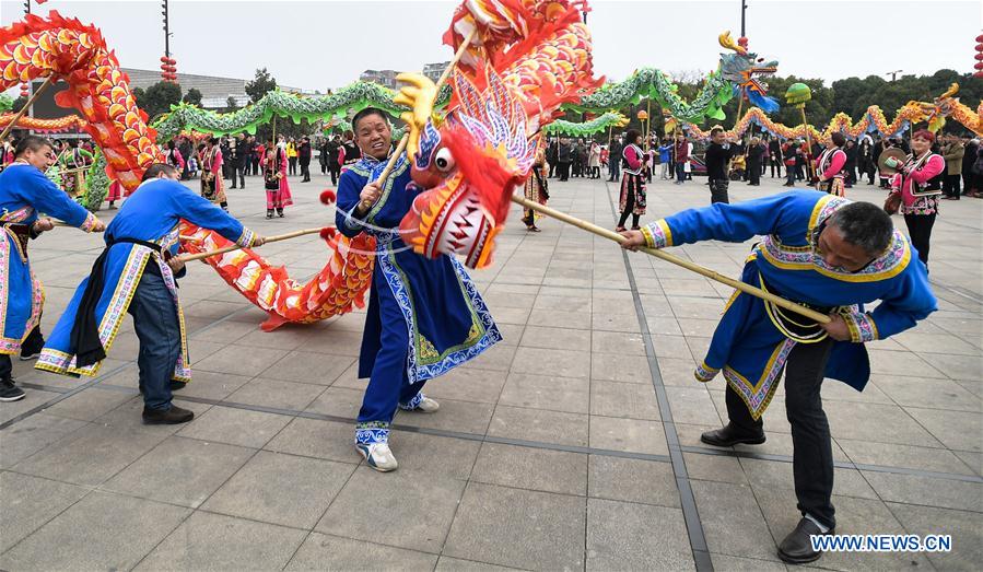 Foto tomada el 17 de febrero del 2018 que muestra a los residentes practicando la Danza del Dragón en el nuevo condado Beichuan, provincia de Sichuan. Beichuan fue una de las áreas más da?adas cuando el fatídico terremoto sacudió el condado. El 12 de mayo del 2008, un terremoto de magnitud 8,0 sacudió Wenchuan, epicentro del lamentable siniestro, destruyendo el condado. Tras diez a?os de esfuerzos, Wenchuan vuelve a la vida. (Foto: Xinhua/Xue Yubin)