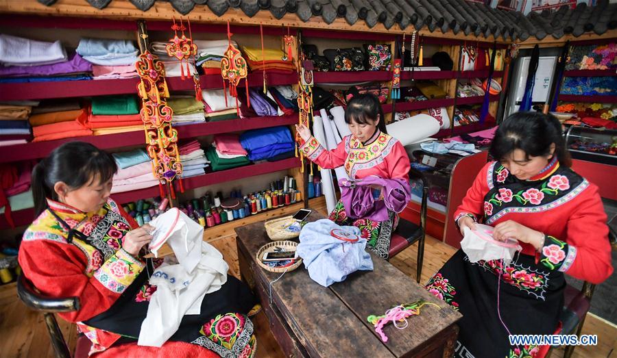 Foto tomada el 2 de mayo del 2018 que muestra a las mujeres del grupo étnico Qiang bordando en el nuevo condado Beichuan, provincia de Sichuan. Beichuan fue una de las áreas más da?adas cuando el fatídico terremoto sacudió el condado. El 12 de mayo del 2008, un terremoto de magnitud 8,0 sacudió Wenchuan, epicentro del lamentable siniestro, destruyendo el condado. Tras diez a?os de esfuerzos, Wenchuan vuelve a la vida. (Foto: Xinhua/Xue Yubin)
