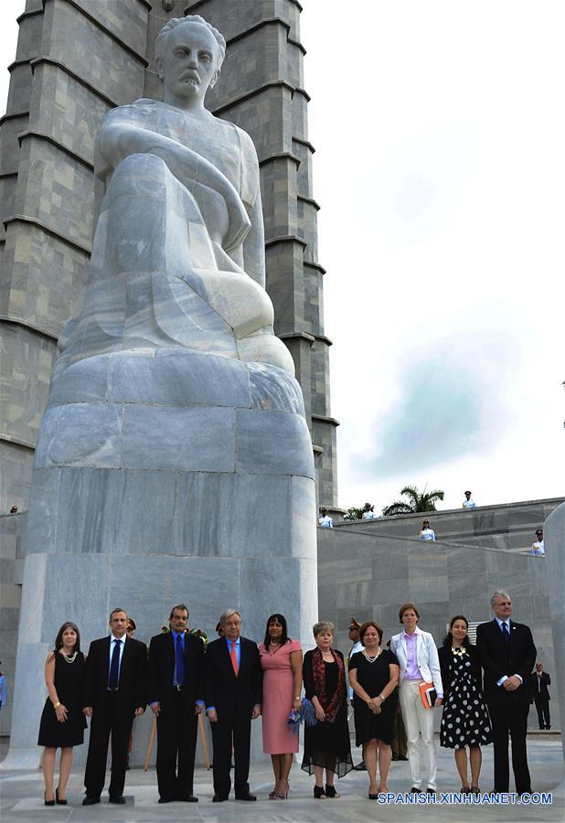 HABANA, mayo 7, 2018 (Xinhua) -- El secretario general de la Organización de las Naciones Unidas (ONU), António Guterres (4-i), acompa?ado por el viceministro de Relaciones Exteriores cubano, Abelardo Moreno (3-i), posa luego de una ceremonia de colocación de una ofrenda floral en el Monumento a José Martí, en La Habana, Cuba, el 7 de mayo de 2018. El secretario general de la Organización de las Naciones Unidas (ONU), António Guterres, llegó el lunes a Cuba en visita oficial, durante la cual asistirá a la apertura del 37 período de sesiones de la Comisión Económica para América Latina y el Caribe (CEPAL), que se realizará ma?ana martes en La Habana. (Xinhua/Joaquín Hernández)