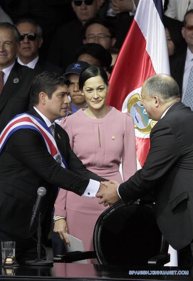 El presidente de Costa Rica, Carlos Alvarado (i-frente), estrecha la mano con el expresidente, Luis Guillermo Solís (d), durante su ceremonia de juramentación, en la Plaza de la Democracia, en San José, capital de Costa Rica, el 8 de mayo de 2018. Carlos Alvarado Quesada, de 38 a?os, fue juramentado el martes como el nuevo presidente de Costa Rica para el periodo de gobierno 2018-2022, en un acto celebrado en la Plaza de la Democracia en la ciudad de San José. Alvarado, quien resultó vencedor en la segunda ronda electoral realizada el 1 de abril pasado en Costa Rica, recibió la banda presidencial que hasta hoy sostuvo Luis Guillermo Solís y que le fue colocada por la presidenta de la Asamblea Legislativa, Carolina Hidalgo. (Xinhua/Kent Gilbert)