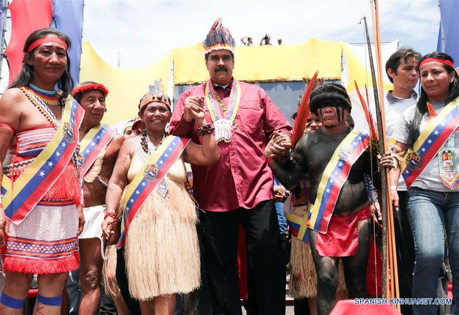 Imagen cedida por la Presidencia de Venezuela del presidente venezolano y candidato a la reelección, Nicolás Maduro (c-abajo), participando en una actividad de campa?a en el estado Amazonas, Venezuela, el 8 de mayo de 2018. De acuerdo con información de la prensa local, Nicolás Maduro anunció el martes la aprobación de recursos para la vivienda, la salud, el transporte y el resguardo de los residentes del estado venezolano Amazonas. (Xinhua/Presidencia de Venezuela)