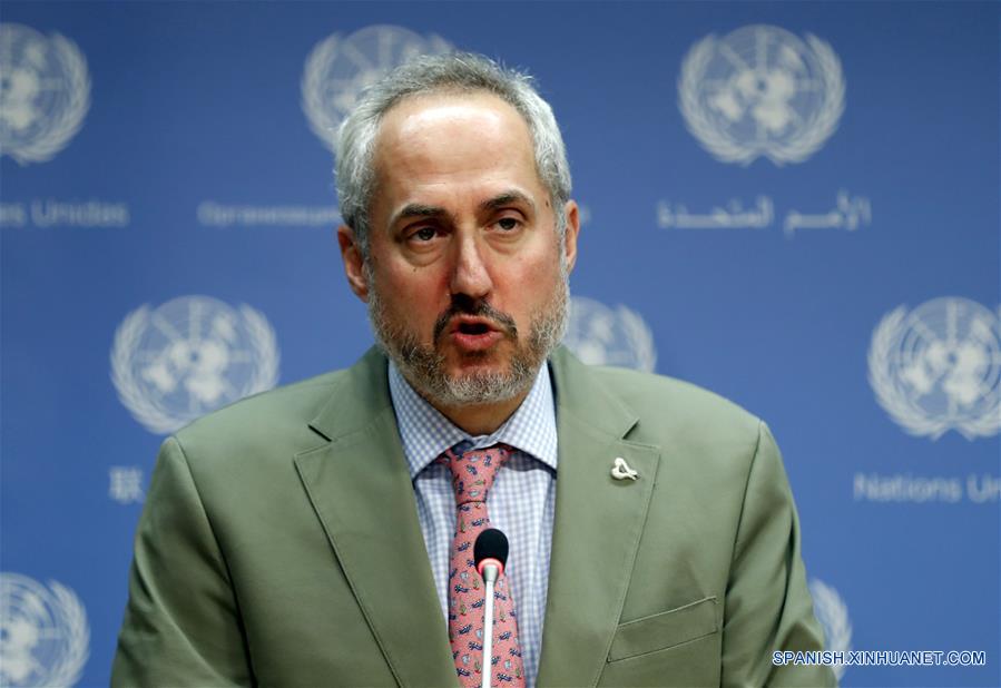 El vocero del secretario general de la Organización de las Naciones Unidas (ONU), Stephane Dujarric, lee una declaración del secretario general de la ONU, António Guterres, con respecto a la retirada de Estados Unidos del acuerdo nuclear iraní, en la sede de la ONU, en Nueva York, Estados Unidos, el 8 de mayo de 2018. El secretario general de la ONU, António Guterres, expresó el martes su "profunda preocupación" por la decisión del presidente de Estados Unidos, Donald Trump, de retirarse del acuerdo nuclear iraní de 2015. (Xinhua/Li Muzi)