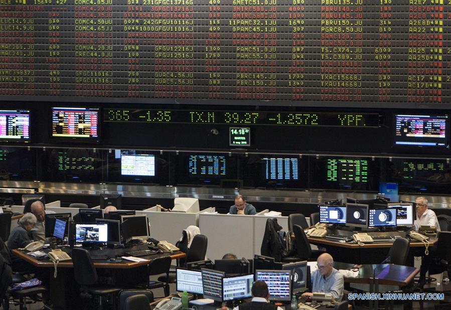 Agentes de bolsa trabajan en la Bolsa de Comercio de Buenos Aires, en Buenos Aires, capital de Argentina, el 8 de mayo de 2018. El presidente argentino, Mauricio Macri, anunció el martes que iniciará conversaciones con el Fondo Monetario Internacional (FMI) para conseguir "una línea de apoyo financiero", en medio de la devaluación del peso frente al dólar que se registra desde la semana pasada. La Bolsa de Comercio de Buenos Aires registró el martes una leve recuperación tras este anuncio. (Xinhua/Martín Zabala)