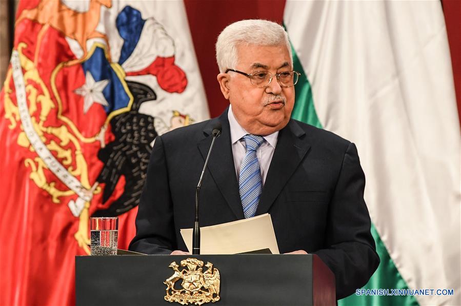 SANTIAGO, mayo 9, 2018 (Xinhua) -- El presidente palestino, Mahmoud Abbas, participa durante una conferencia de prensa conjunta con el presidente de Chile, Sebastián Pi?era, llevada a cabo en el Palacio de La Moneda, en Santiago, capital de Chile, el 9 de mayo de 2018. De acuerdo con información de la prensa local, el presidente Mahmoud Abbas, se encuentra en Chile para una visita oficial. (Xinhua/Jorge Villegas)