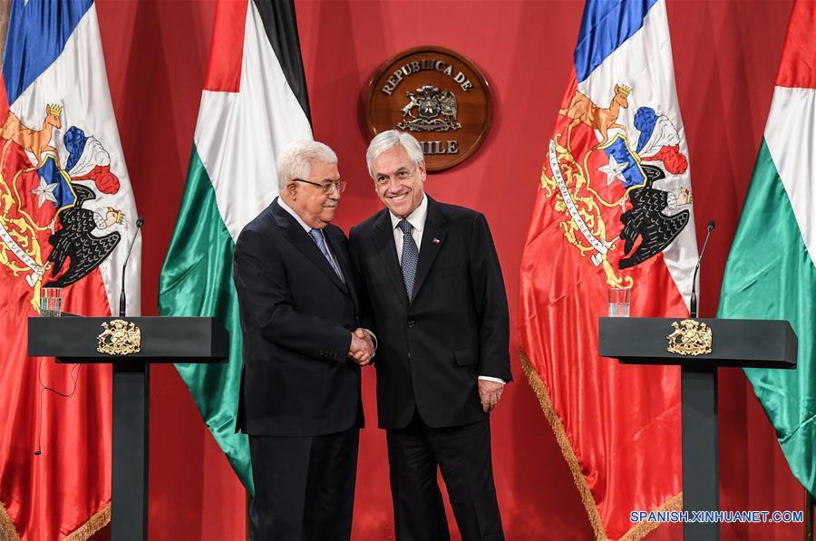 SANTIAGO, mayo 9, 2018 (Xinhua) -- El presidente de Chile, Sebastían Pi?era (d), estrecha la mano del presidente palestino, Mahmoud Abbas (i), después de una conferencia de prensa conjunta, llevada a cabo en el Palacio de La Moneda, en Santiago, capital de Chile, el 9 de mayo de 2018. (Xinhua/Jorge Villegas)