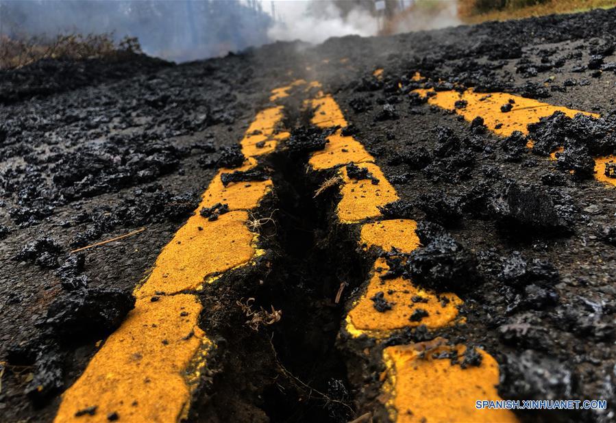 HAWAII, mayo 10, 2018 (Xinhua) -- Imagen del 9 de mayo de 2018 de una vista de las grietas y los desechos volcánicos captados en una carretera en el estado de Leilani, Hawaii, Estados Unidos. De acuerdo con informes del gobierno del estado de Hawaii, las erupciones del volcán Kilauea obligaron a la evacuación de miles de personas. (Xinhua/Tao Xiyi)