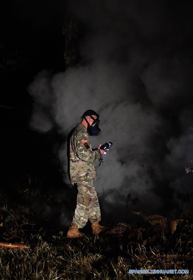 HAWAII, mayo 10, 2018 (Xinhua) -- Oficiales del Ejército estadounidense revisan los niveles de dióxico de azufre en la fisura 13, en el estado de Leilani, Hawaii, Estados Unidos, el 10 de mayo de 2018. De acuerdo con informes del gobierno del estado de Hawaii, las erupciones del volcán Kilauea obligaron a la evacuación de miles de personas. (Xinhua/Tao Xiyi)