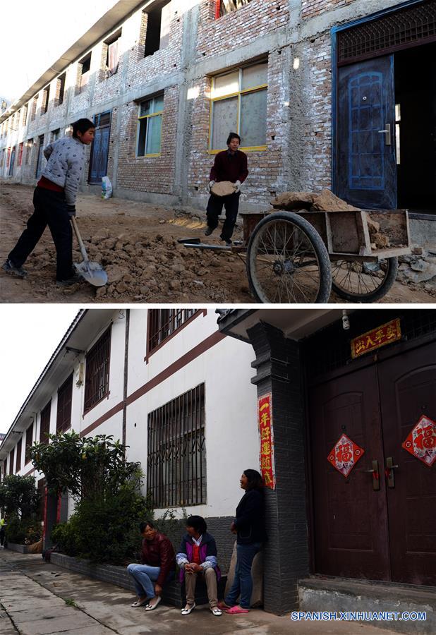 GANSU, mayo 10, 2018 (Xinhua) -- Imagen combinada de residentes trabajando en el sitio de construcción de nuevas viviendas el 24 de enero de 2009 (arriba), y residentes dialogando en la calle el 9 de mayo de 2018 (abajo), en la villa de Gan'en de la ciudad de Longnan, provincia de Gansu, en el noroeste de China. La villa de Gan'en es una nueva villa construida para reubicar a los residentes de la villa de Haoping, que resultó severamente da?ada por el terremoto de Wenchuan 8.0 grados de magnitud ocurrido en 2008 en la vecina provincia de Sichuan. La villa fue nombrada "Gan'en" a finales de 2008 para expresar gratitud por los esfuerzos de reconstrucción realizados. Después de diez a?os de arduo trabajo, la villa de Gan'en ha recuperado la vida. (Xinhua/Ma Ning, Fan Peishen)