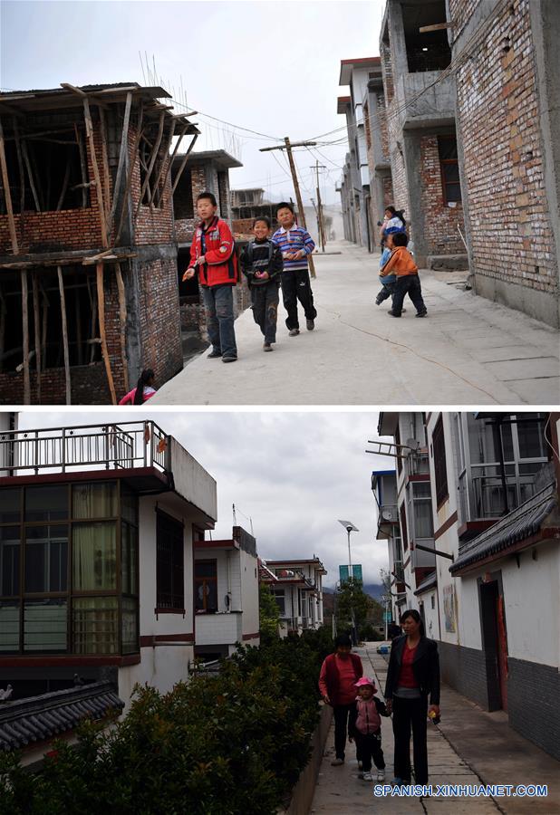 GANSU, mayo 10, 2018 (Xinhua) -- Imagen combinada de ni?os jugando en el sitio de construcción el 25 de abril de 2009 (arriba), y residentes caminando en la calle el 9 de mayo de 2018 (abajo), en la villa de Gan'en de la ciudad de Longnan, provincia de Gansu, en el noroeste de China. La villa de Gan'en es una nueva villa construida para reubicar a los residentes de la villa de Haoping, que resultó severamente da?ada por el terremoto de Wenchuan 8.0 grados de magnitud ocurrido en 2008 en la vecina provincia de Sichuan. La villa fue nombrada "Gan'en" a finales de 2008 para expresar gratitud por los esfuerzos de reconstrucción realizados. Después de diez a?os de arduo trabajo, la villa de Gan'en ha recuperado la vida. (Xinhua/Nie Jianjiang, Fan Peishen)