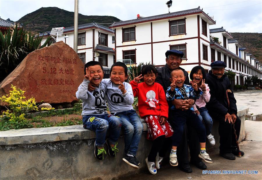 GANSU, mayo 10, 2018 (Xinhua) -- Imagen del 9 de mayo de 2018 del residente Li Shide (4-i) posando para una fotografía grupal con ni?os y otro hombre mayor, en la villa de Gan'en de la ciudad de Longnan, provincia de Gansu, en el noroeste de China. La villa de Gan'en es una nueva villa construida para reubicar a los residentes de la villa de Haoping, que resultó severamente da?ada por el terremoto de Wenchuan 8.0 grados de magnitud ocurrido en 2008 en la vecina provincia de Sichuan. La villa fue nombrada "Gan'en" a finales de 2008 para expresar gratitud por los esfuerzos de reconstrucción realizados. Después de diez a?os de arduo trabajo, la villa de Gan'en ha recuperado la vida. (Xinhua/Fan Peishen)