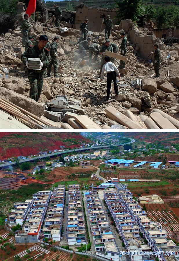 GANSU, mayo 10, 2018 (Xinhua) -- Imagen combinada de rescatistas retirando los escombros en la villa de Haoping el 16 de mayo de 2008 (arriba), y la nueva villa de Gan'en de la ciudad de Longnan, provincia de Gansu, en el noroeste de China el 9 de mayo de 2018 (abajo). La villa de Gan'en es una nueva villa construida para reubicar a los residentes de la villa de Haoping, que resultó severamente da?ada por el terremoto de Wenchuan 8.0 grados de magnitud ocurrido en 2008 en la vecina provincia de Sichuan. La villa fue nombrada "Gan'en" a finales de 2008 para expresar gratitud por los esfuerzos de reconstrucción realizados. Después de diez a?os de arduo trabajo, la villa de Gan'en ha recuperado la vida. (Xinhua/Lian Zhenxiang, Fan Peishen)