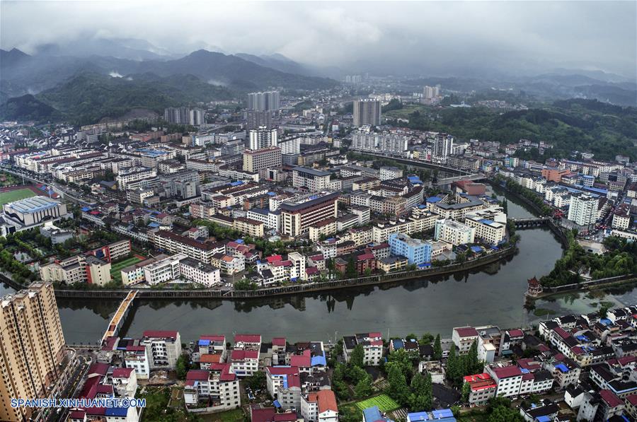SHAANXI, abril 25, 2018 (Xinhua) -- Imagen del 23 de abril de 2018 de una vista aérea del condado de Ningqiang, provincia de Shaanxi, en el noroeste de China. El condado de Ningqiang fue afectado por un terremoto devastador que se centró en el condado de Wenchuan en la provincia de Sichuan, en el suroeste de China, el 12 de mayo de 2008. Luego de diez a?os de reconstrucción, las condiciones de vida han sido mejoradas y la economía ha repuntado fuertemente. Unos 113 sitios de reasentamiento fueron construidos y aproximadamente 23,000 familias se mudaron a viviendas nuevas. Unas 66 escuelas fueron reconstruidas y alrededor de 268 nuevas clínicas rurales fueron construidas. (Xinhua/Tao Ming)