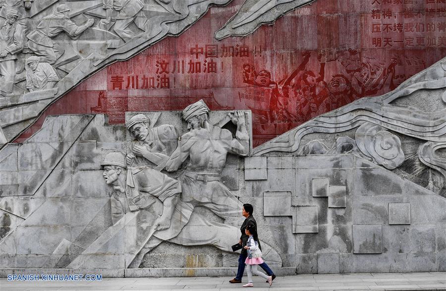 SICHUAN, abril 27, 2018 (Xinhua) -- Imagen del 26 de abril de 2018 de personas caminando frente a un muro conmemorativo, en el condado de Qingchuan, provincia de Sichuan, en el suroeste de China. El condado de Qingchuan, que se vio gravemente afectado por un terremoto catastrófico el 12 de mayo de 2008, ahora tiene una apariencia nueva después de la reconstrucción. (Xinhua/Tao Ming)