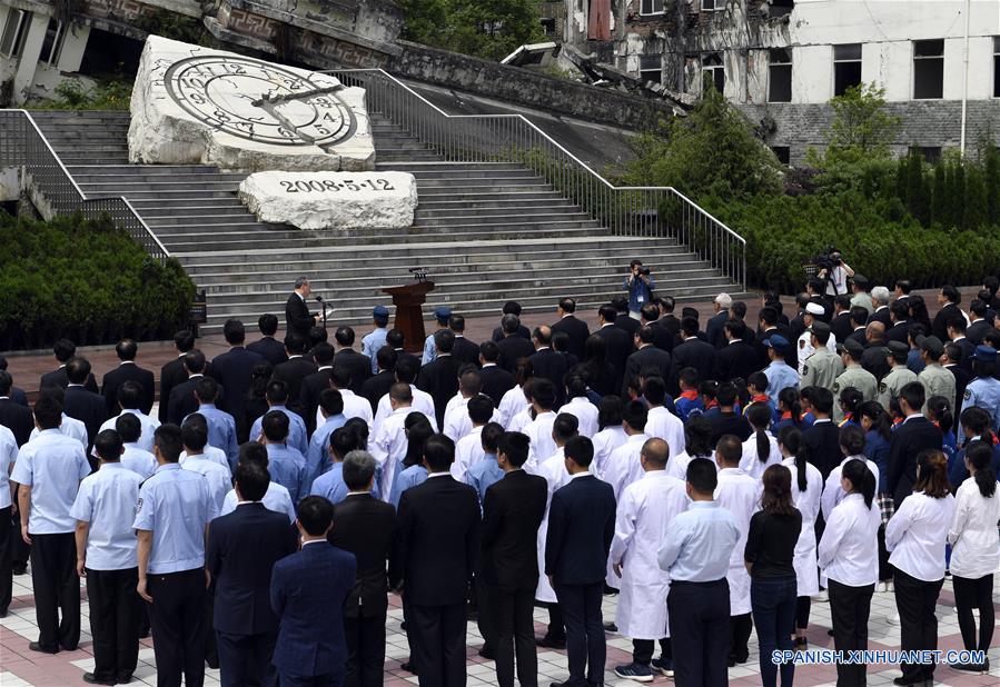 Personas se reúnen en el sitio en ruinas de la Escuela Secundaria Xuankou mientras participan en una ceremonia conmemorativa llevada a cabo con motivo del 10 aniversario del Terremoto de Wenchuan, en el municipio de Yingxiu del condado de Wenchuan, provincia de Sichuan, en el suroeste de China, el 12 de mayo de 2018. Un terremoto de 8 grados de magnitud en la escala de Richter sacudió el condado de Wenchuan el 12 de mayo de 2008, dejando más de 69,000 muertos, 374,000 heridos, 18,000 desaparecidos y millones sin hogar. (Xinhua/Liu Kun)
