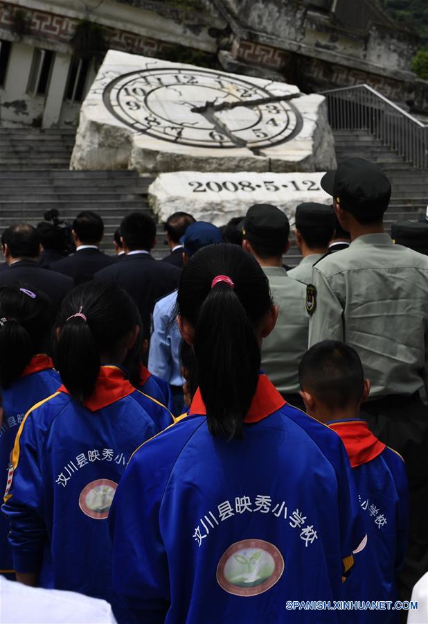 se reúnen en el sitio en ruinas de la Escuela Secundaria Xuankou mientras participan en una ceremonia conmemorativa llevada a cabo con motivo del 10 aniversario del Terremoto de Wenchuan, en el municipio de Yingxiu del condado de Wenchuan, provincia de Sichuan, en el suroeste de China, el 12 de mayo de 2018. Un terremoto de 8 grados de magnitud en la escala de Richter sacudió el condado de Wenchuan el 12 de mayo de 2008, dejando más de 69,000 muertos, 374,000 heridos, 18,000 desaparecidos y millones sin hogar. (Xinhua/Liu Kun)