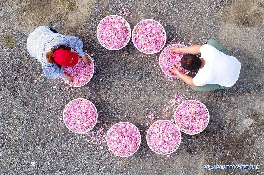 Imagen aérea de agricultores revisando las nuevas rosas en la villa Shizhuang del condado de Hai'an, en la provincia de Jiangsu, en el este de China, el 14 de mayo de 2018. (Xinhua/Xiang Zhonglin)