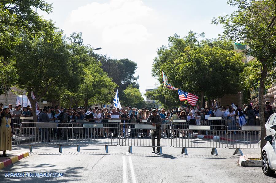 JERUSALEN, mayo 14, 2018 (Xinhua) -- Israelíes participan en una marcha para celebrar la nueva embajada estadounidense en Jerusalén, el 14 de mayo de 2018. De acuerdo con información de la prensa local, la ceremonia de inauguración de la nueva embajada estadounidense en Jerusalén comenzó el lunes por la tarde, israelíes y funcionarios estadounidenses se reunieron en la ciudad mientras ocurrían fuertes enfrentamientos en la Franja de Gaza. (Xinhua/Guo Yu)