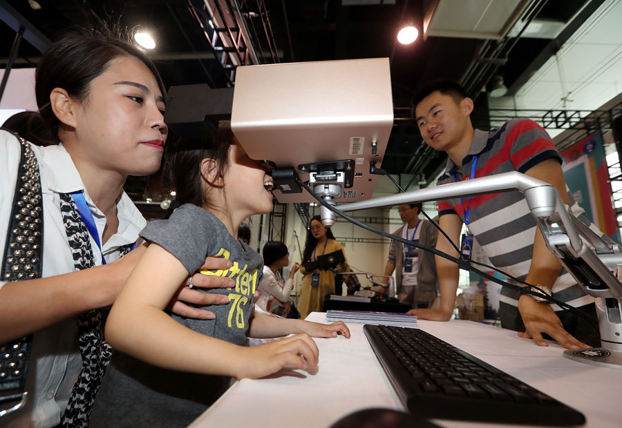 Una madre ayuda a su hija a ver una película corta en un visor multisensorial que puede emitir aromas, esencias y olores relacionados con el contenido, en la Exposición de Empresas Unicornio de Alta Tecnología 2018 en Hangzhou, provincia de Zhejiang, el 29 de abril. Productos como los visores de video de alta tecnología distinguen a las empresas unicornio de China de las de otros países. [Foto de Lin Yunlong / For China Daily]