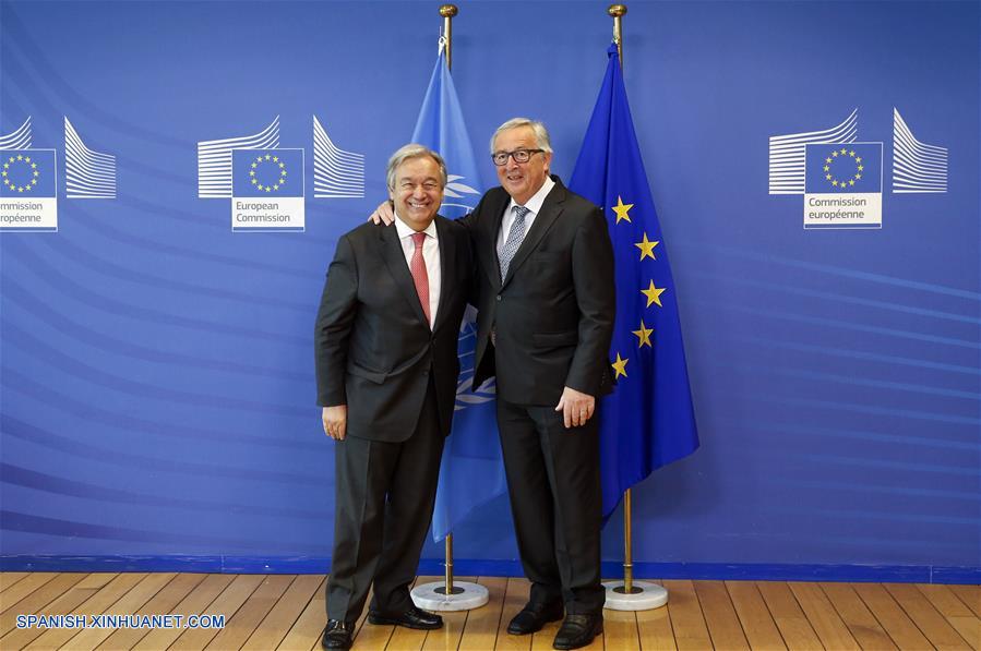 BRUSELAS, mayo 16, 2018 (Xinhua) -- El presidente de la Comisión Europea, Jean-Claude Juncker (d), se reúne con el secretario general de la Organización de las Naciones Unidas (ONU), Antonio Guterres (i), en Bruselas, Bélgica, el 16 de mayo de 2018. (Xinhua/Ye Pingfan)