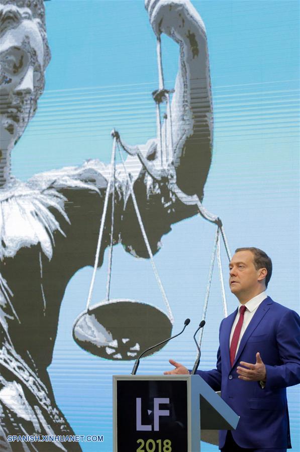 SAN PETERSBURGO, mayo 16, 2018 (Xinhua) -- El primer ministro de Rusia, Dmitry Medvedev, pronuncia un discurso en el Foro Legal Internacional de San Petersburgo, en San Petersburgo, Rusia, el 16 de mayo de 2018. La legislación rusa ya no puede ignorar las transacciones en el ambiente digital y el Parlamento está trabajando en conceptos legalmente estrictos de dinero digital y derechos digitales, dijo el miércoles el primer ministro ruso Dmitry Medvedev en el Foro Legal Internacional en San Petersburgo. (Xinhua/Irina Motina)