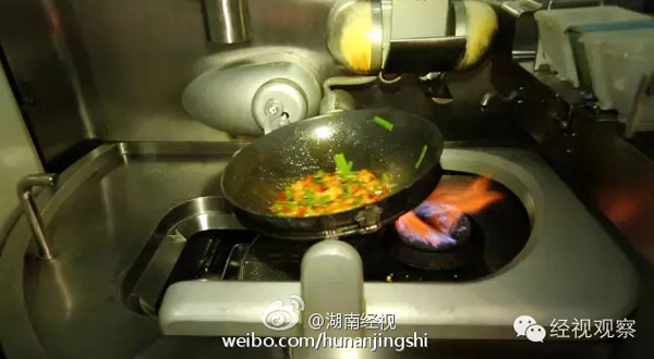 Un robot-chef prepara un plato en el restaurante de Li en la ciudad de Changsha, provincia de Hunan, en el centro de China. [Foto / Sina Weibo]