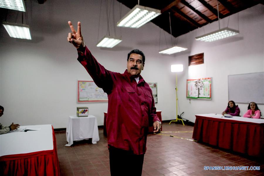 CARACAS, mayo 20, 2018 (Xinhua) -- El presidente venezolano y candidato a la reelección por el partido Frente Amplio de la Patria, Nicolás Maduro, posa luego de emitir su voto en un centro de votación en el colegio Miguel Antonio Caro, en Catia, Caracas, Venezuela, el 20 de mayo de 2018. El presidente venezolano y candidato a la relección, Nicolás Maduro, ejerció su derecho al voto a primera hora en las elecciones presidenciales y de consejos legislativos que se llevan a cabo el domingo en el país suramericano. "He sido el primer votante de la patria", dijo Maduro en una rueda de prensa tras depositar su voto en el colegio Miguel Antonio Caro, ubicado en Catia, parte de una populosa parroquia al oeste de Caracas. El jefe de Estado rechazó "la campa?a feroz" contra las elecciones venezolanas realizada por algunos países y medios occidentales. (Xinhua/Boris Vergara)
