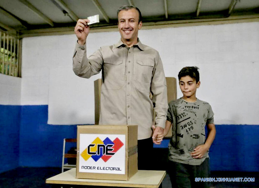 ARAGUA, mayo 20, 2018 (Xinhua) -- El vicepresidente Ejecutivo venezolano, Tareck El Aissami (i), muestra su voto en un centro de votación del estado Aragua, Venezuela, el 20 de mayo de 2018. Los centros de votación abrieron sus puertas la ma?ana del domingo en Venezuela para la elección simultánea del presidente de la república y 251 representantes de los consejos legislativos. La presidenta del Consejo Nacional Electoral (CNE), Tibisay Lucena, informó que durante la primera hora de apertura de los centros de votación, hay un 80 por ciento de las mesas electorales constituidas. Venezuela ha dispuesto 34,143 mesas electorales en 14,638 centros de votación para recibir a los 20 millones 526 mil 978 electores habilitados para votar. (Xinhua/Vicepresidencia de Venezuela/AVN)