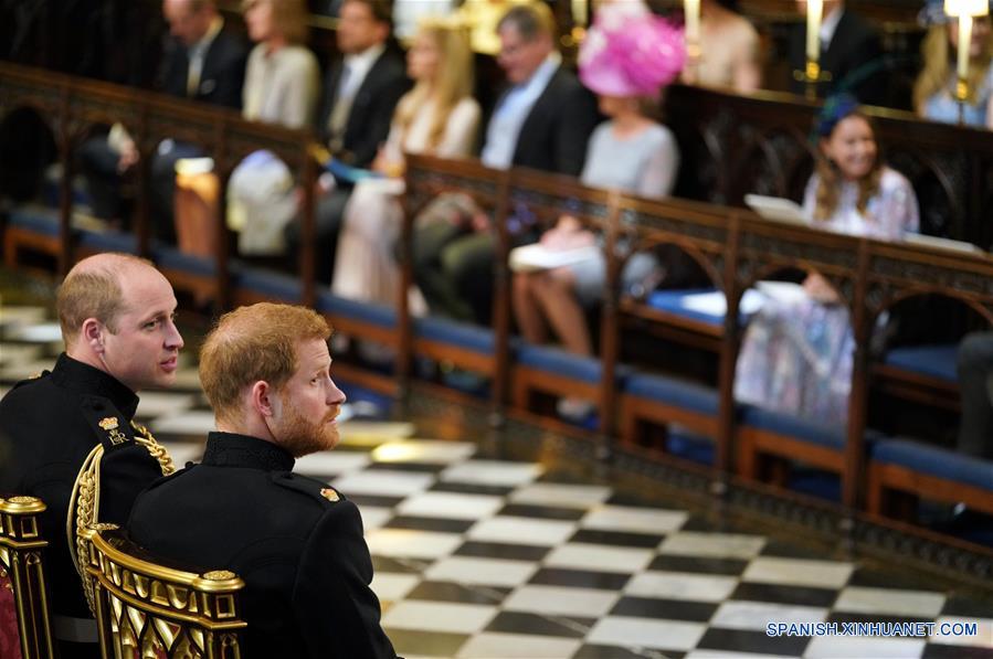 El príncipe Enrique (d) permanece sentado junto al príncipe Guillermo (i), duque de Cambridge, durante la celebración de su boda real con Meghan Markle, en la capilla de San Jorge en el Castillo de Windsor, en Windsor, Reino Unido, el 19 de mayo de 2018. (Xinhua/Dominic Lipinski/PA Wire/ZUMAPRESS)